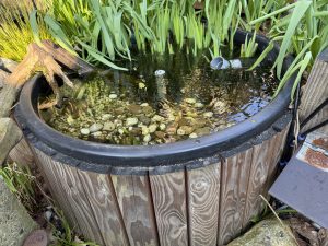 Deze bak (foto 5) is gekoppeld aan de vijver en fungeert als plantenfilter en indien nodig kunnen er ook vissen in.