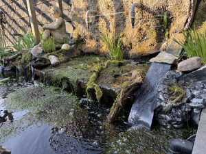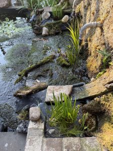 Op de foto zie je de muur met Sphagnum, water stroomt via twee drukfilters door de twee kranen in een bak dit is deels bio en deels een planten filter, er ligt een Japanse zuurstof slang in en nog een slang voor extra water, het water stroomt dan weer de grote vijver in!
